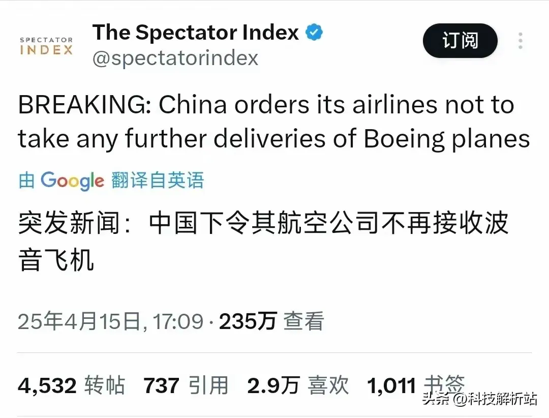 波音采用全球采购方式组装飞机,中国是其重要的零部件供应地。特朗普的关税大战导致中国零部件难以供应给波音,而我们就是要借此打击美国制造业,以牙还牙。况且波音是美国研制六代机的核心厂商,我们自然要对其“断炊”。