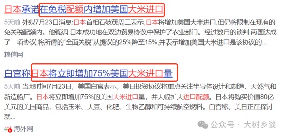 日本也有类似情况。美日谈判后,特朗普非常兴奋地发推,称“日本终于低头!美国大米汽车将畅通无阻!”,如果属实,意味着日本坚持60年的“大米铁幕”终结,随后美国白宫还称日本将立即增加75%的美国大米进口量,还要大幅扩大进口配额,于是外媒纷纷跟进,报道称“日本开放大米进口”。但日本首相石破茂辟谣,日本大米进口的总配额仍然是77万吨以内,只不过考虑在这一配额内更多采购美国大米。