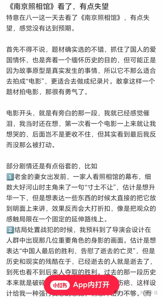 小镇在看电影的时候,最担心的就是出现日本侵略者的良心发现、人性挣扎,甚至反过来帮助中国人逃生。如果这样,小镇会很憋屈,这是对英烈和死难同胞们的亵渎,几十万同胞的死难,变成了日本侵略者表演的背景板。