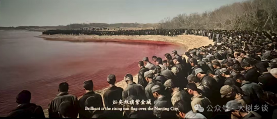 还有一个画面,日本侵略者为了给死掉的日本鬼子招魂,大肆屠杀中国人作为活祭,黑压压的中国人被逼着站在河边,而河水已经红透了,说明这绝不是第一次大屠杀。