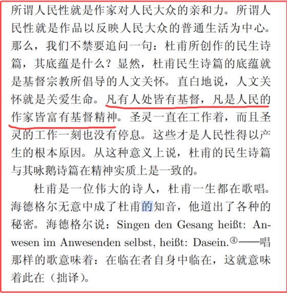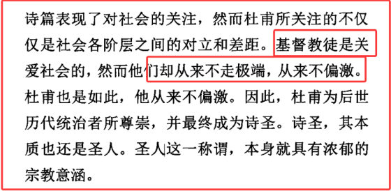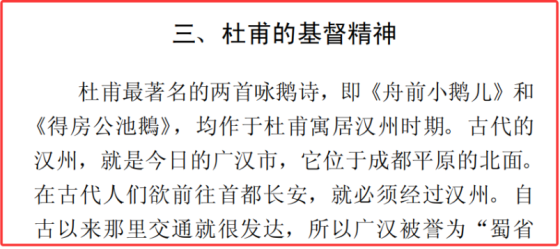 在另一篇关于杜甫的文章《杜诗中的道教法术与杜甫的宗教观》,他再次夹带私货,再次吹捧基督教,说基督教的璀璨光芒,让杜甫懂得人必须在有限的人生岁月中有所作为。