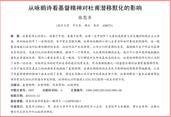 我们来看看武汉大学中文系的张思齐教授,拿着国家社会科学基金会的钱,竟然把杜甫研究成了基督徒,连《咏鹅》都成了基督精神的产物。