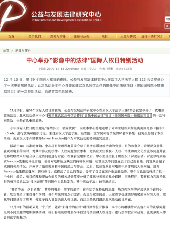 成立仅一年后,公益法中心便在美国国务院的资助下与美国驻武汉总领馆合作举办了「影像中的法律」系列活动。两年后,公益法中心的张万洪主任就这个美国资助的项目作了「项目成果汇报」。
