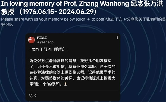在武大公益法中心为其主任张万洪设立的在线追悼网页上,我们发现了丁某某的实名留言。