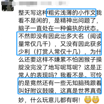 就像我们理解不了牠们一样,牠们同样理解不了我们。我水平不高,但我自信还不至于“粗劣浅薄”。至于阅读少,没多少人捧场,恰恰说明我追求的不是那些。再说了,这么少的捧场牠们都受不了,要是捧场人太多,牠们岂不是更受不了?