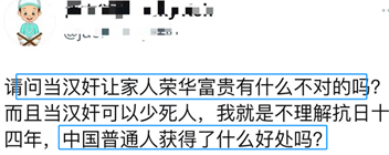 当然,正常人理解不了二鬼子的思维是正常的。例如,有二鬼子声称,“当汉奸让家人荣华富贵有什么不对的吗?而且当汉奸可以少死人,我就是不理解抗日十四年,中国普通人获得了什么好处吗?”看到了吧,在二鬼子看来,当汉奸非但不是什么可耻的坏事,还是可以让家人“荣华富贵”的“好事”,对此,我只能说,人与人的差距,有时候还真比人和狗的差距还要大。