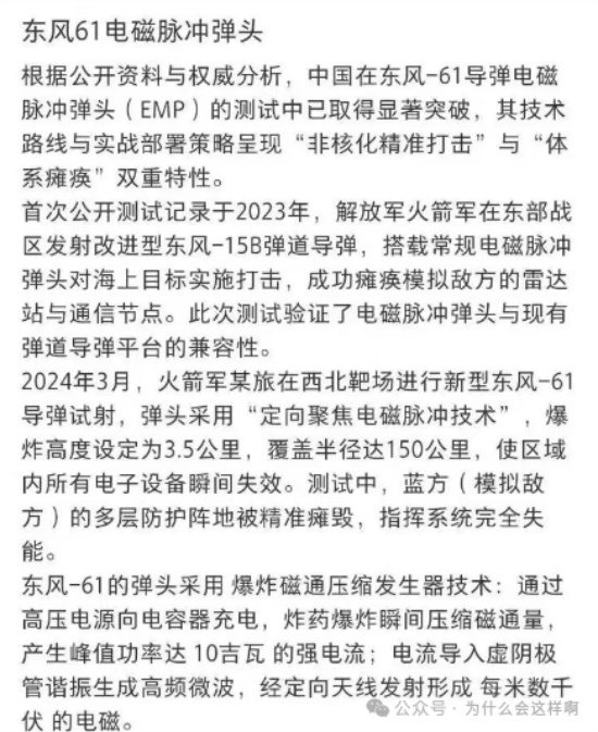 东风51还不知道有多厉害呢,61大家就更不知道了,搜索也都是空白,搜不到,根本搜不到,于是,说啥的都有,有说这是电磁脉冲核爆蛋的,说这玩意打出去覆盖半径150公里,也就是说这玩意能够让150公里范围内的所有电子设备瞬间失灵,如果战端开启,这玩意来几发,那么敌人就彻底变成了聋子瞎子,只有挨打的份了。
