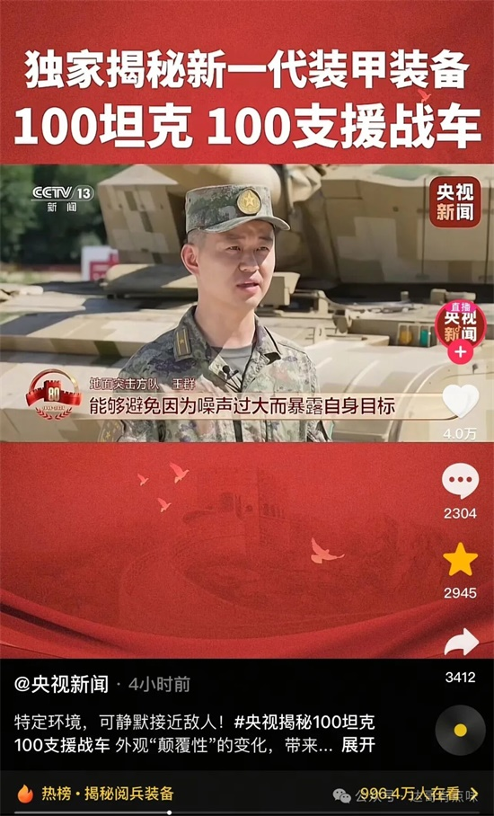 王群的原话是“100坦克和100支援战车两型装备能够实现在特定环境下静默接近敌人,能够避免因噪音过大而暴露自身目标。”