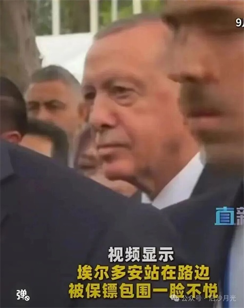 土耳其总统埃尔多安也遭遇同样状况,埃尔多安在多名保镖簇拥下,站在马路边,愤怒的表情不加掩饰。