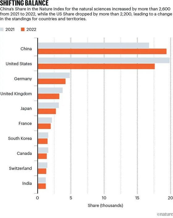 从2022年开始,中国的自然指数就实现了对美反超,位居世界第一