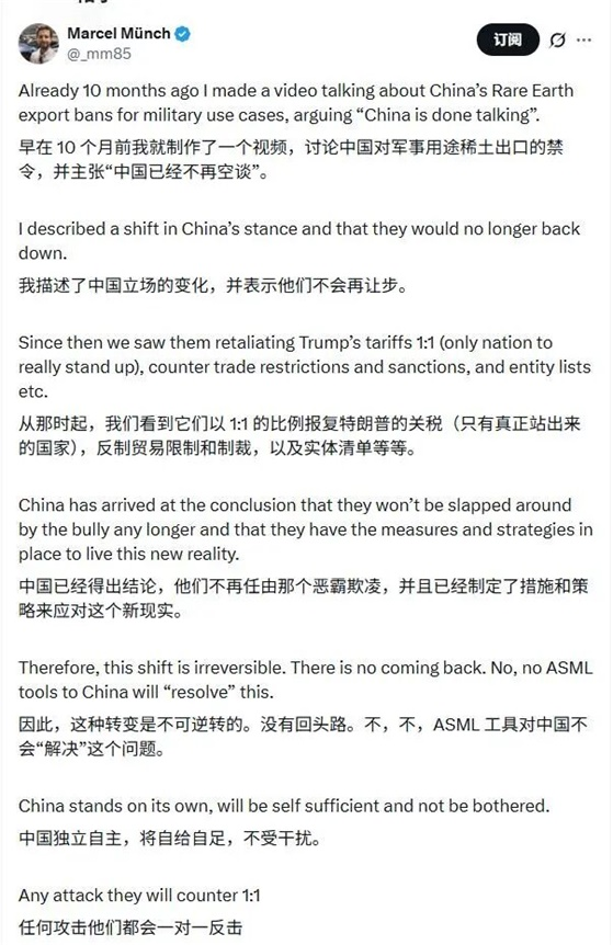 “早在10个月以前,我就制作过一期视频节目,讨论了中国针对军事用途的稀土出口禁令,当时我提出的观点就是:中国言尽于此,没什么好说的了。我明确阐述了中国立场的转变,并且指出中国人不会再作出任何退让了。自那之后,我们目睹了中国对川普关税实施对等反制、出台贸易限制与制裁措施,以及建立实体清单等一系列行动。注意,中国是本轮贸易战中唯一一个敢于真正挺身而出的国家。”