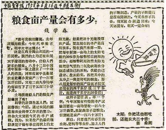 1958年6月,钱学森在《人民日报》、《中国青年报》发表题为《粮食亩产会有多少?》的文章
