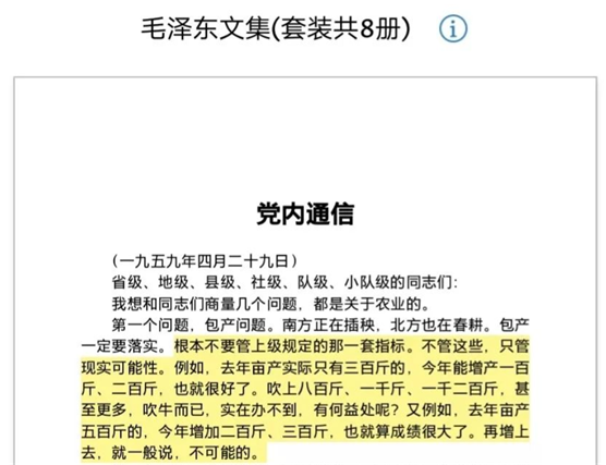 在反对浮夸风的指示无法贯彻的情况下,毛主席于1959年4月29日写了要求一直下发到小队一级的《党内通信》,明确说“增加二百斤、三百斤,就算成绩很大了。再增上去,就一般说,不可能的。”