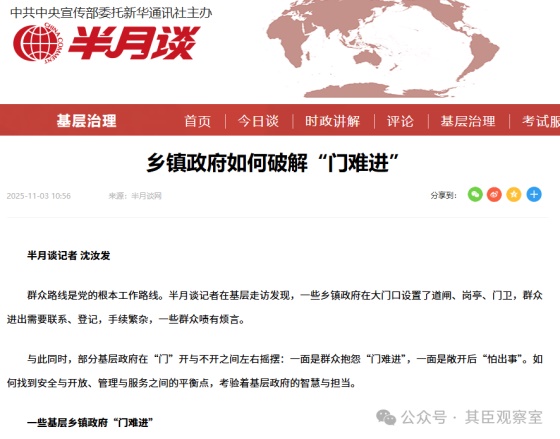 《半月谈》杂志于2025年11月3日,发表了一篇文章,标题为《乡镇政府如何破解“门难进”》。