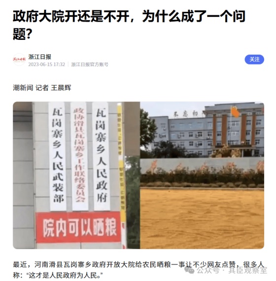 另外,据《浙江日报》报道:河南滑县瓦岗寨乡政府开放大院给农民晒粮一事让不少网友点赞,很多人称:“这才是人民政府为人民。”