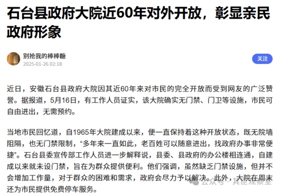 比如:有报道安徽石台县政府大院因其近60年来对市民的完全开放而受到网友的广泛赞誉。