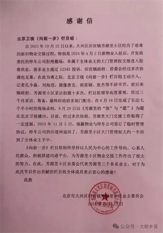 北京卫视《向前一步》节目,就多次以物业服务纠纷为主体,拉着相关各方一起化解矛盾。比如2024年9月29日播出的《芳源里的“怨”与“愿”》,聚焦北京大兴区芳源里小区艰难的新旧物业交接矛盾,通过多次协商,芳源里小区大门管理权约一半回到了全体业主手中。注意,这仅仅是半个大门,小区物业管理服务之难,可见一斑。