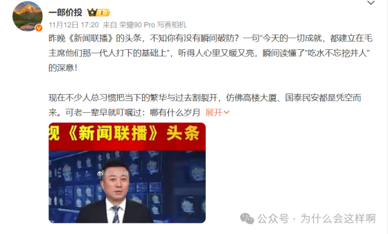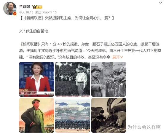 这几天,接连看到一些微博还有文章提到了近日央视的《新闻联播》中专门提到中国今天的一切成就,都是建立在毛主席等老一辈革命家打下的江山,攒下的家底之上......许多听到新闻联播这段话的群众,都忍不住心情激动,高兴万分,在高兴之余,纷纷以自己的方式奔走相告,或者写文章,或者发微博,纪念这难得一见的事情。