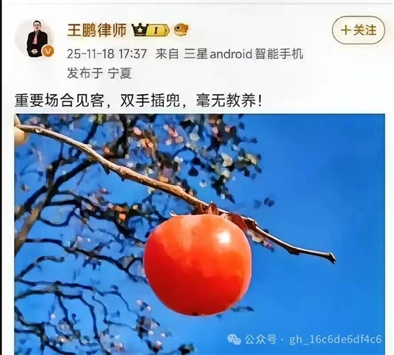律师王鹏的行径,更是突破了职业底线与公民本分。他公然在社交平台发文,指责外交部司长 “在重要场合会见客人时手插兜,毫无教养”—— 这番言论看似是 “专业评判”,实则是对国家公权力的恶意抹黑与无端攻击。