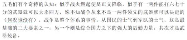 接下来,他们说,“五毛们有个奇特的认知:似乎战火燃起便是正义降临,似乎有一两件能打六七十分的武器就可以大杀四方,殊不知战争从来不是一两件领先的武器就可以决定的”。这话要一分为二的看,首先,这不是“五毛们”的认知,而是美西方,特别是美国的认知,美国之所以热衷于对外发动战争,不就是仗着武器比别人的更多、更先进吗?