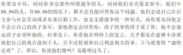 对于所谓的“你要是不信,问问你身边那些叫嚣战争的人,问问他们是否愿意参军”的问题,我刚才就说过了,他们不愿意,有的是人愿意,要是中国人都像他们一样怕死,还会有抗日战争、抗美援朝战争的胜利吗?