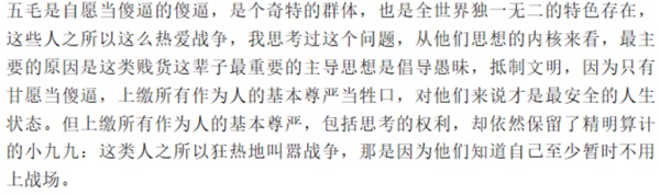 或许是骂爽了,骂顺嘴了,接下来又是对“五毛”的一顿嘴炮输出,“奇特的群体”“全世界独一无二的特色存在”“贱货”“最重要的主导思想是提倡愚昧,抵制文明”“上缴所有作为人的基本尊严当牲口”……论扣帽子,他们要说第二,确实没人敢说第一了。