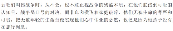 这不是“热爱战争”,而是热爱和平。敢战方能止战,他们该不会以为我们会像他们那样,别人一个眼神就都跪在那里吧?跪着是他们想要的“最坏的和平”,但不是我们想要的,我们所要的和平,是中国人能够平视世界的和平,是中国人有自由、有尊严的和平。