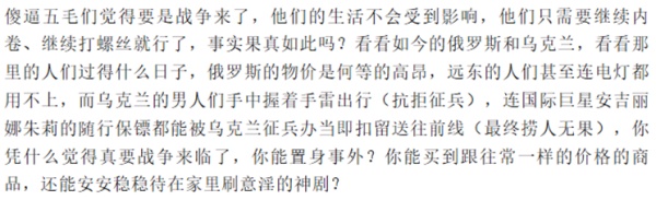 他们还说,“傻逼五毛们觉得要是战争来了,他们的生活不会受到影响,他们只需要继续内卷、继续打螺丝就行了”。还是那句话,他们是从哪里看出爱国的都是“打螺丝”的?那种高高在上的样子,真的恶臭,恶臭到家了。