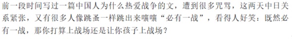 昨晚,有朋友给我发了个名为《对日本开战?说说那些希望开战的人》的“小作文”,看完后,我只能说,人和人的区别,有时真的比人和狗还要大。