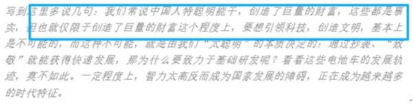 他们还说中国人很“聪明”,但“(中国人)要想引领科技,创造文明,基本上是不可能的”。别的我就不说了,我就问他,中华文明是不是文明,是不是比所谓的“西方文明”更高级的文明?中国人没有像西方国家那样到处殖民吧,没有像西方国家那样贩卖过黑奴吧,既然如此,他们为何要如此自轻自贱呢?