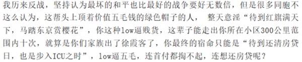然后就是他们惯用的“顶着价值五毛钱的绿色帽子”“low逼贱货”“low逼五毛”“连首付都掏不起”之类的统称“你穷,你不配爱国”的经典话术了。我很想问问他,穷怎么了,当年的八路军、新四军更穷,穷耽误他们爱国,耽误他们打鬼子了吗?