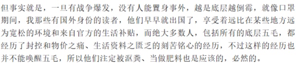 接下来就是经典的发泄仇恨环节了。他们大概忘了,口罩期间美国是死了多少人的,欧洲是如何被迫放弃六十岁以上的“老人”的了,他们大概也忘了,当初是谁哭着喊着“我要是死了,就是谋杀”的了。至于所谓的“封控和物价之痛”,以我为例,除了最初半个月,之后生活受到影响的加起来不超过10天。他们真以为我们这么快就都忘了?孙子,我们还活着呢,要想搞什么岁月史书,下辈子吧。