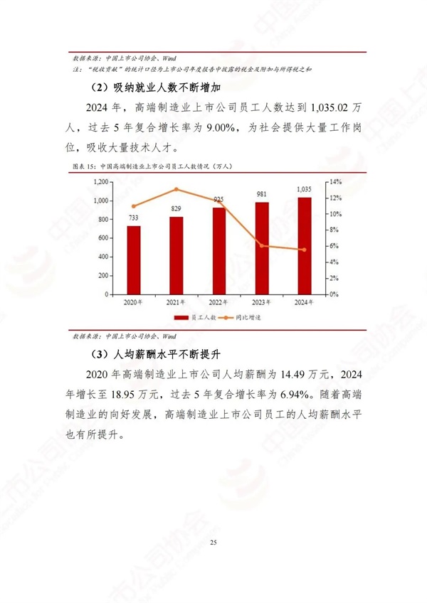 此外,高端制造业上市公司税收、就业两方面的贡献也在不断增长。《报告》显示,2024年,我国高端制造业上市公司税收贡献达2538.96亿元,过去5年复合增长率为10.85%;员工人数达1035.02万人,过去5年复合增长率为9.00%,成为吸纳技术人才、稳定就业市场的重要阵地。