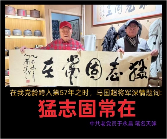 马将军今年八十有六,老骥伏枥,志在千里,烈士暮年,壮心不已。带领一支创作团队,在河北大平原上挖掘红色抗战题材,马将军不嫌我连县级作协会员也不是的一个民间文艺创作志愿者,纳为他团队的一员,他指我创作之方向,传我文艺为工农兵服务之传统,帮我修改提升剧本之升华,带我挖掘红色文化之源泉,教我打磨精品之经验。马将军的微信头像是“一马当先”,带动我朝前奔跑,他是“猛志固常在”的好榜样,今日他为我党龄跨进五十七年的题字,是传帮带,是鞭策,我铭记在心,学老将军人老党心未老,做一名猛志固常在的共产党员文艺老兵。