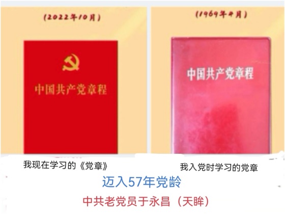 12月1日,是我加入中国共产党的日子。1969年的这一天,我们村的贫协主席和民兵连长向党支部全体党员介绍我入党,一致举手通过。5日,公社武装部长代表公社党委与我谈话并领誓,从此成为毛主席领导的中国共产党正式党员。后来每逢这一天,自我纪念。今天打开两个版本的《党章》,一本现在实行的2022年“二十大”新《党章》,另一本是我入党时1969年“九大”旧《党章》,对照过去过去的一年自我总结,自我评价,自我纪念。2021年6月,我领到“光荣在党五十年”纪念章的时候,曾动情地写了一篇长文发表。去年写的是《日月归去又复来一一跨进56年党龄的自我纪念》,今跨进第57个年头之际,该怎么开写呢?