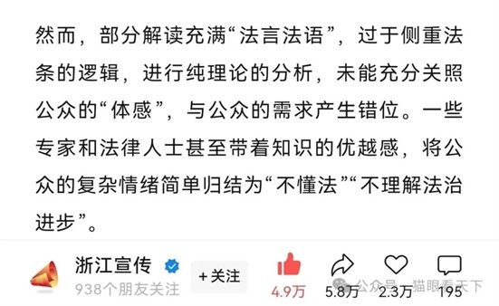 随后,由中宣部委托新华社主办的刊物《半月谈》通过视频号转发了浙江宣传的这篇评论文章。
