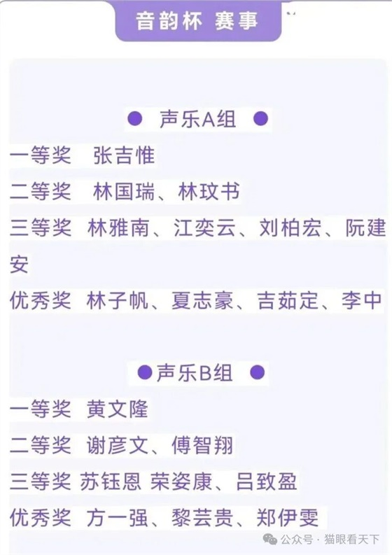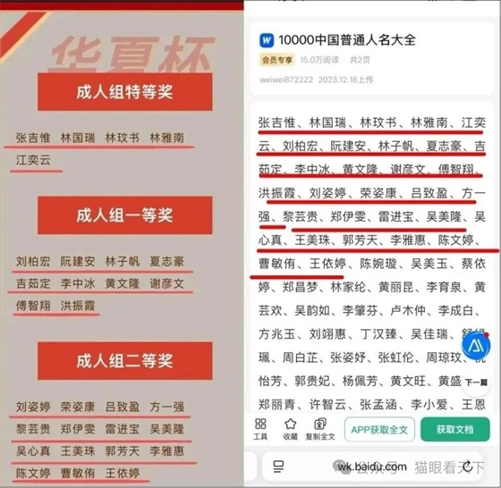 这是某地艺教机构公布了其声乐比赛的获奖名单。对比一下人名大全,这上面的名字都是来自于网络。当然前五位就是大名鼎鼎的忙碌5人组。