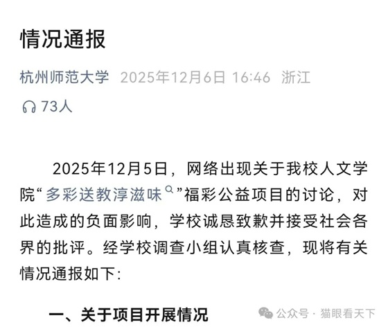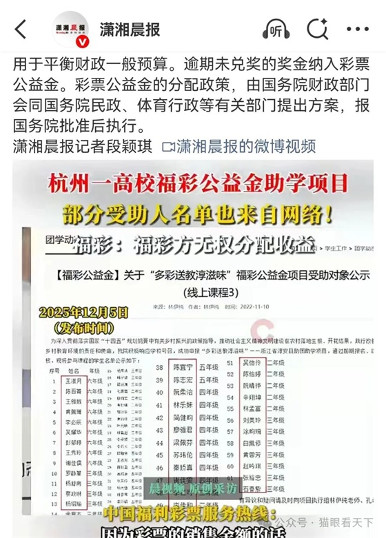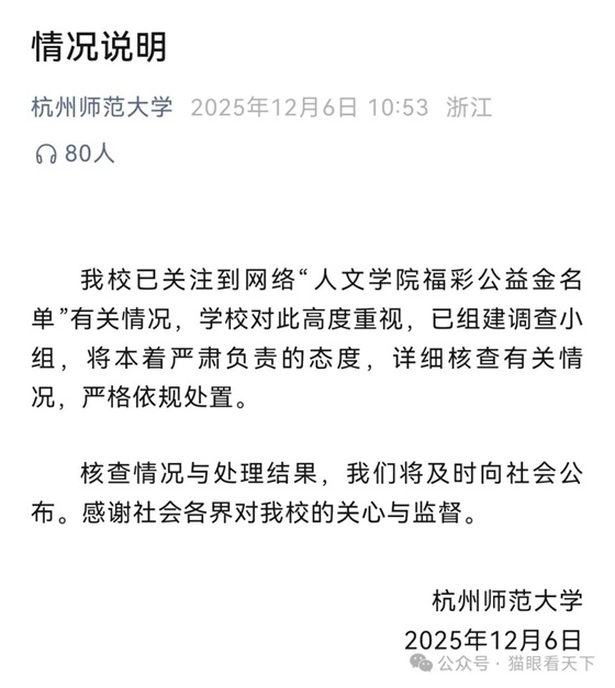 12月5日,有媒体报道杭州师范大学人文学院于2022年公布的《【福彩公益金】关于“多彩送教淳滋味”福彩公益金项目受助对象公示(线上课程3)》名单,共62名受助学生姓名及排序与《中国人名大全》完全一致,共涉及45万元的公益金。当然,最强五人组名单就在其中。