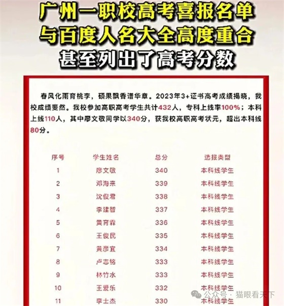 还有网友扒出,近日南方某省的一所职校发布了一则高职高考喜报,名单中依然是那一串串熟悉的名单。