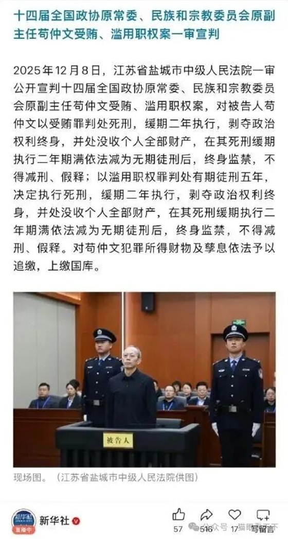 近日,江苏省盐城市中级人民法院一审公开宣判,判处苟受贿罪判处死刑,缓期二年执行,剥夺政治权利终身,并处没收个人全部财产,在其死刑缓期执行二年期满依法减为无期徒刑后,终身监禁,不得减刑、假释。对苟仲文犯罪所得财物及孳息依法予以追缴,上缴国库。