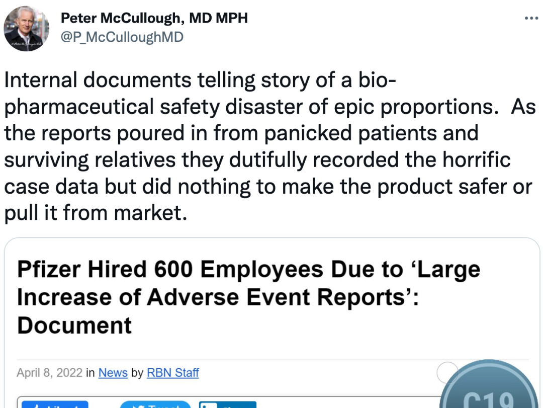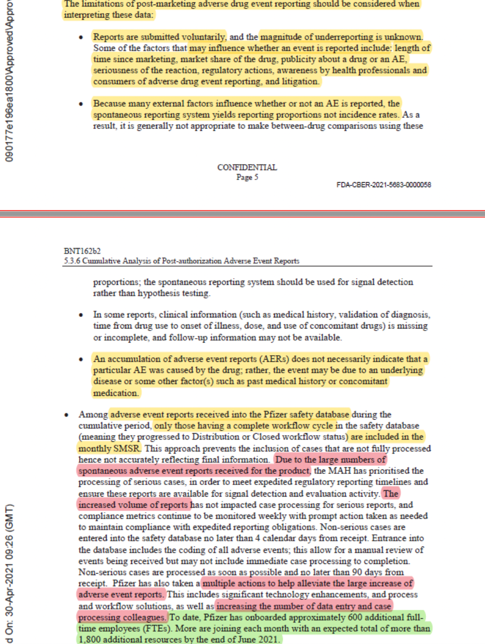 3、辉瑞公司文件显示大量自发性不良事件报告激增,在其COVID-19疫苗获得授权后的三个月内额外雇佣了大约600名全职员工来处理不良事件报告。