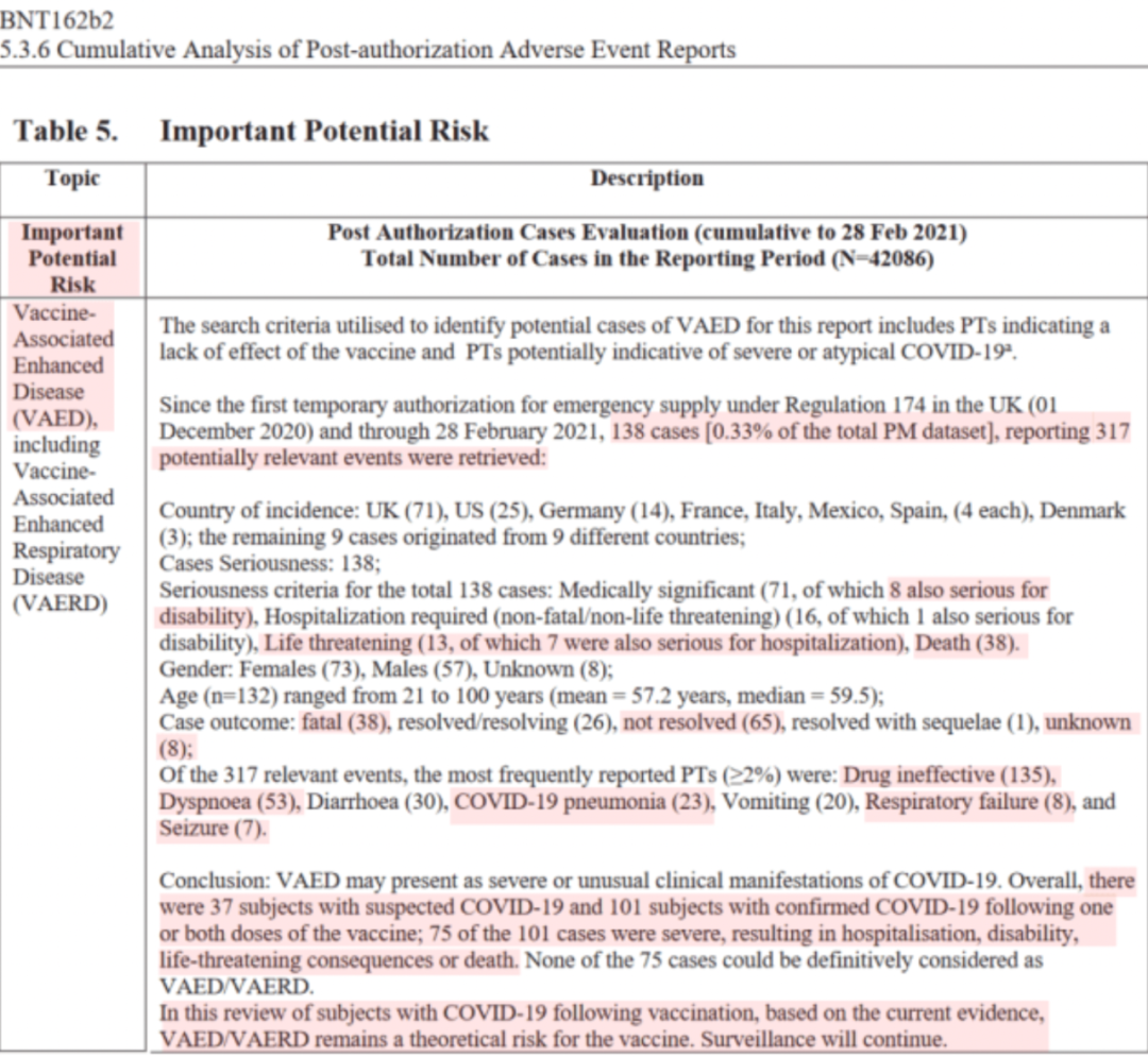 辉瑞文件中说了,截至2021年2月28日,报告了317起可能与疫苗相关的抗体依赖增强(VAED)疾病事件。