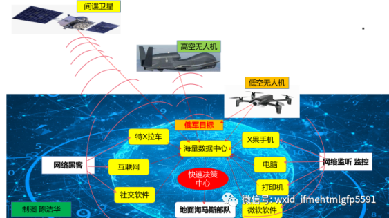 上述卫星、高空、低空、地面、手机等全方位获得的动态信息,可迅速与巨大的信息库智能比对,即可研判:是不是俄军?多少人?做什么?空间位置在哪?剩下就是命令:海玛斯开炮。