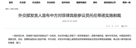 【中国宣布对菲律宾前参议员托伦蒂诺发起制裁】